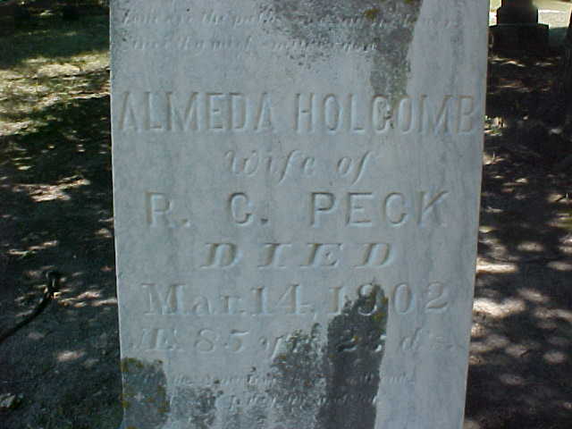 Almeda Holcombe was born on 19 February 1817. She was the daughter of Hosea Holcombe and Hulda Quimba. Almeda Holcombe died on 14 March 1902 at age 85. She was buried at Sunnyside Cemetery, New Berlin, Waukesha Co., WI.
